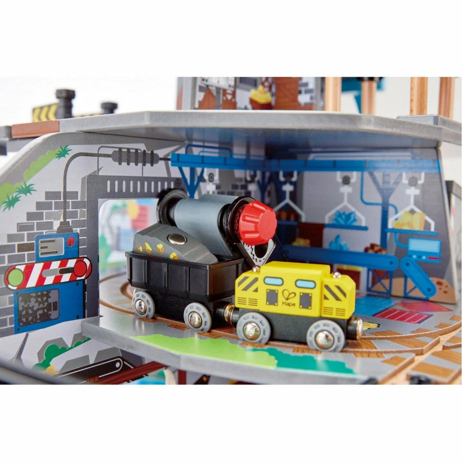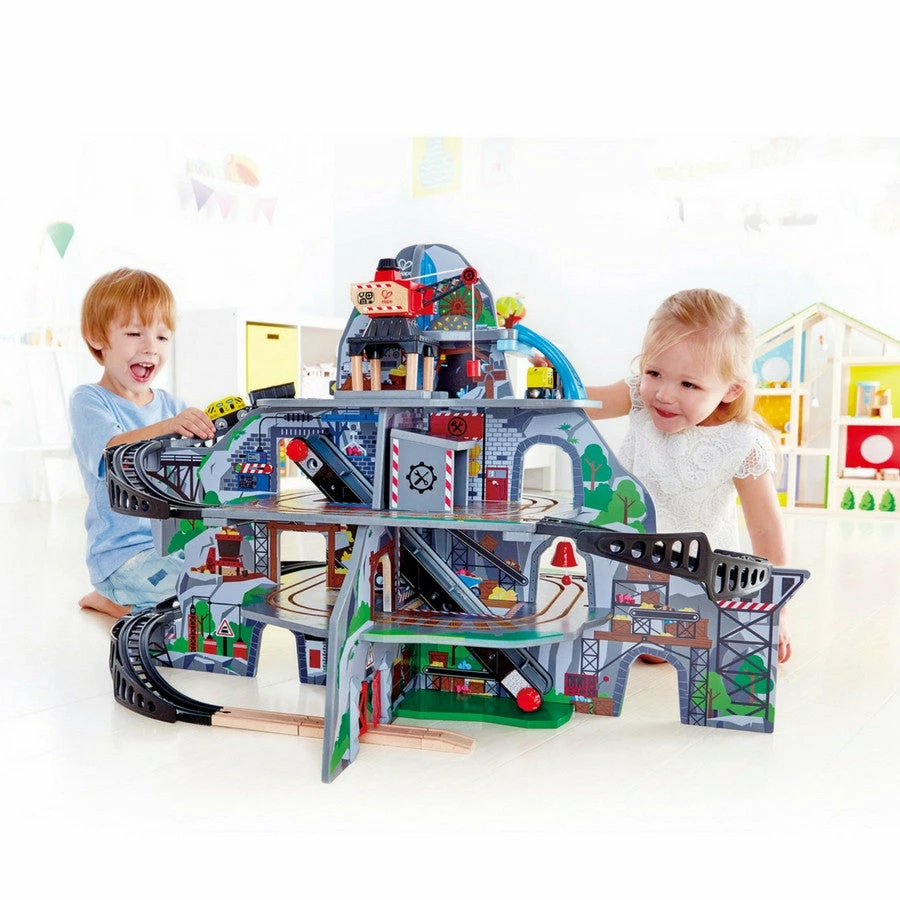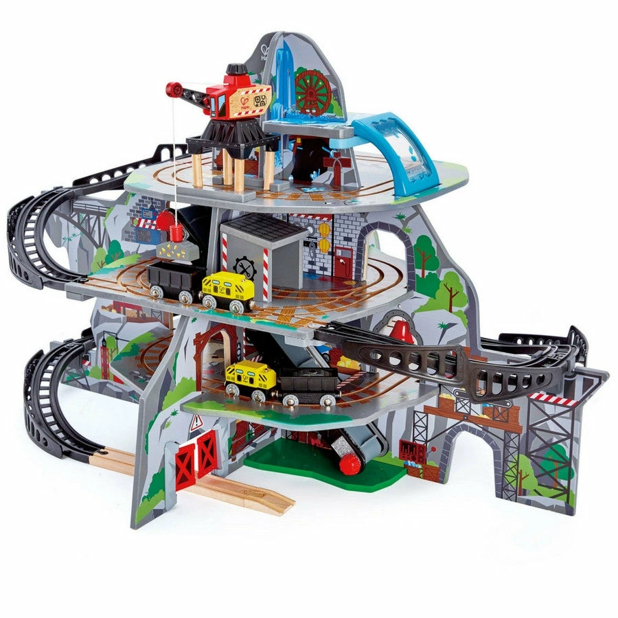 The award winning Hape Mighty Mountain Wooden Railway contains multiple levels and provides the ultimate wooden-railway play experience including accessories such as a waterfall tunnel, an obstacle bridge, a crane, a conveyor belt, a repair station, a warning bell and double and rotating doors.